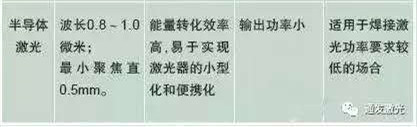 二、半導體激光焊接的光源在激光焊接工藝中,隨著半導體材料工業(yè)的快速發(fā)展,半導體激光作為光源也漸漸得到了應用。焊接的特點如表1所示: