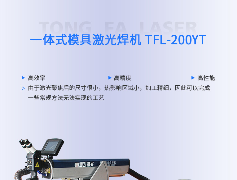 通發(fā)激光一體式模具激光焊機TFL-200YT/TFL-400YT是一款多種功能融合一體的新型模具激光焊接機,針對特大型塑料模具激光焊、中型注塑模具激光燒焊、小型塑膠模具激光補焊、壓鑄模激光補焊具等各類模具可實現(xiàn)超精密修復(fù),幫您解決大型汽車模具修復(fù)難題,不需要模具移動,電動工作臺與立體旋轉(zhuǎn)激光頭完美結(jié)合,操作桿控制運動移動實現(xiàn)輕松激光修復(fù)大型模具,同時也保留了傳統(tǒng)手動工作臺超精密修復(fù)模具功能。